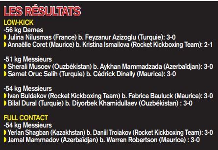 Hier, la victoire d’Annaëlle Coret a redonné le sourire au directeur technique de la Fédération mauricienne de kick-boxing, Judex Jeannot. En début de journée, ce dernier a encaissé les éliminations de ses trois éléments masculins. Le premier Mauricien à avoir été éliminé est Warren Robertson en full-contact. Face à Jamal Mammadov, il n’a pas pu réussi l’exploit tant attendu. Comme en 2019, l’Azerbaïdjanais se retrouve en finale des -54 kg contre Yerlan Shagban. Cédrick Dinally a perdu son combat contre le Turque Samet Oruc Salih dans la catégorie -51 du tournoi low-kick alors qu’il menait aux deux premiers rounds. Quant à Fabrice Bauluck, il s’est incliné contre le Russe Ivan Buldakov après un combat acharné dans la catégorie des -54 kg en low-kick. Les trois reviendront avec le bronze.