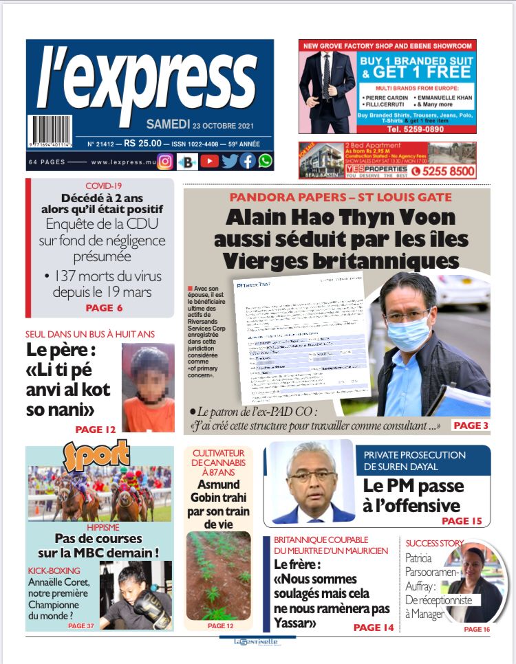 En une de l'express: Pandora Papers – St Louis Gate: Alain Hao Thyn Voon aussi séduit par les îles Vierges britanniques ; Autre titre: Private Prosecution de Suren Dayal: Le PM passe à l’offensive.