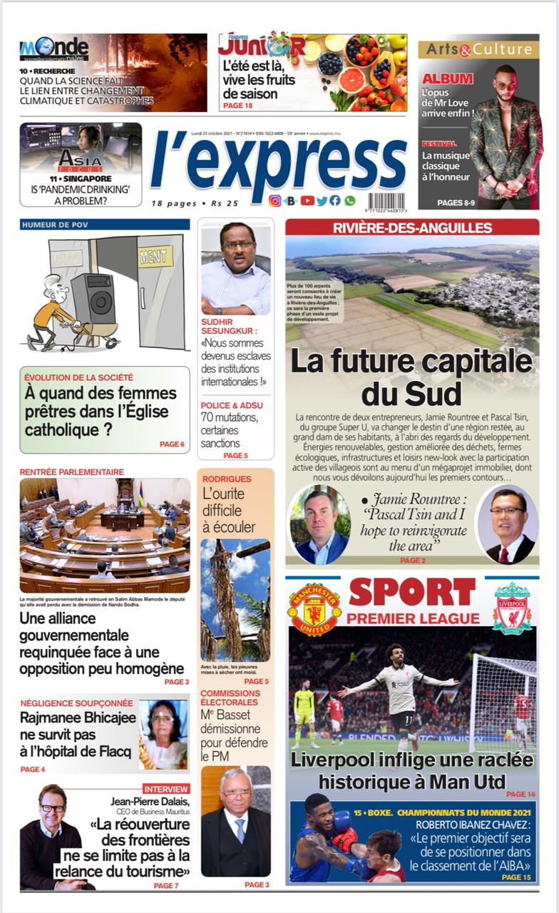 En Une de l'express; Rivière-des-Anguilles: La future capitale du Sud; Autre titre; Sport - Premier League: Liverpool inflige une raclée historique à Man Utd.