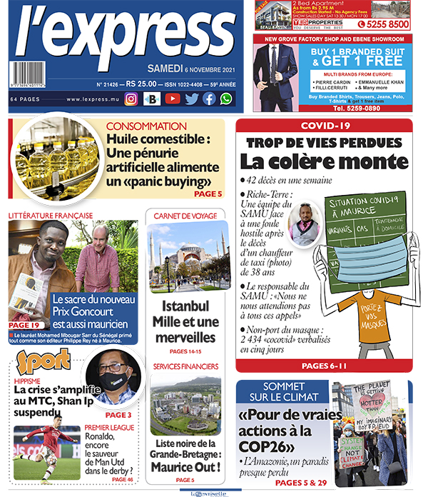 En une de l'express: Covid-19: 42 morts enregistrés cette semaine ; Autre titre: Huile comestible: une pénurie artificielle alimente un «panic buying»