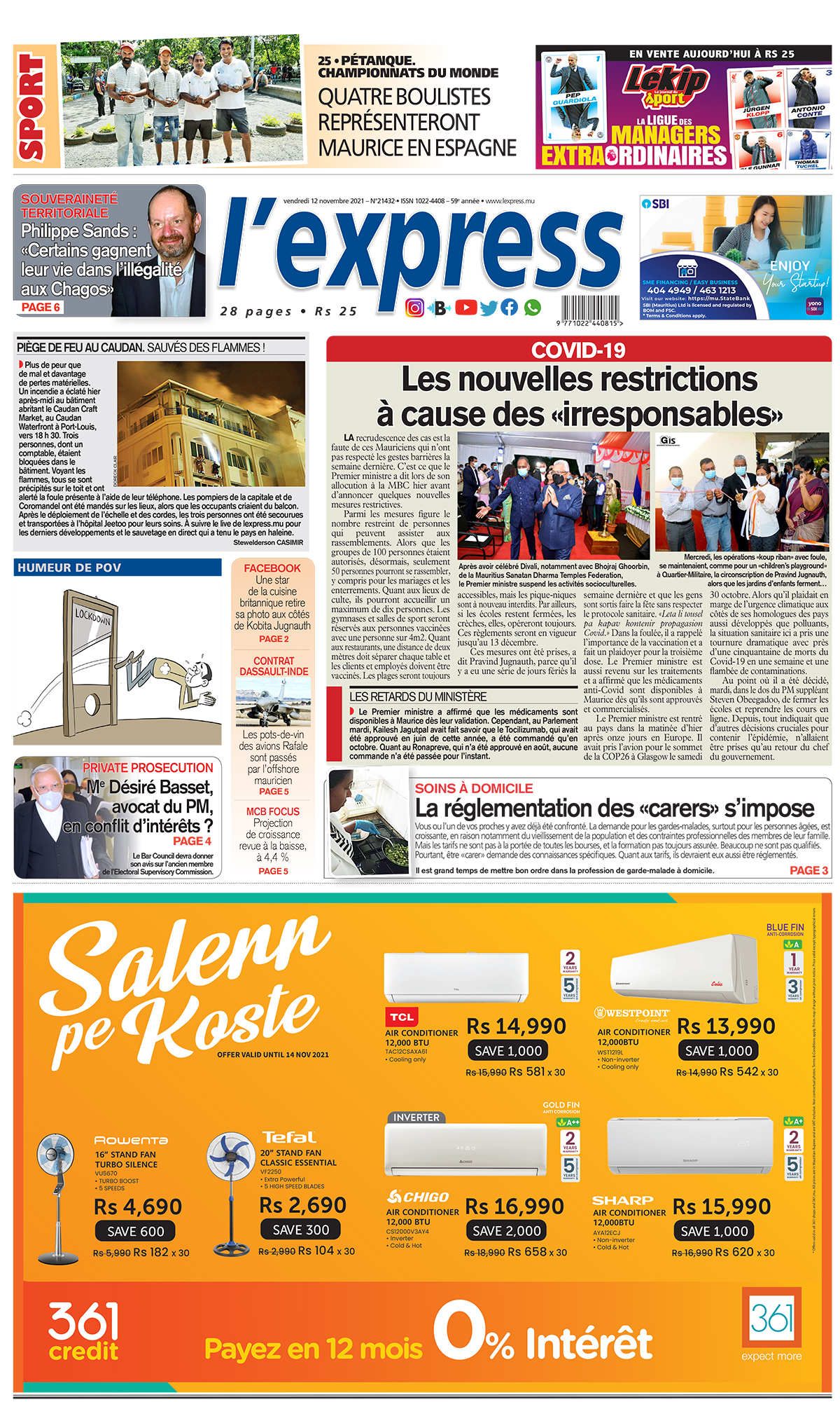 En Une de l'express; Covid-19 : Les nouvelles restrictions à cause des «irresponsables»; Autre titre; Soins à domicile : La réglementation des «carers» s’impose.