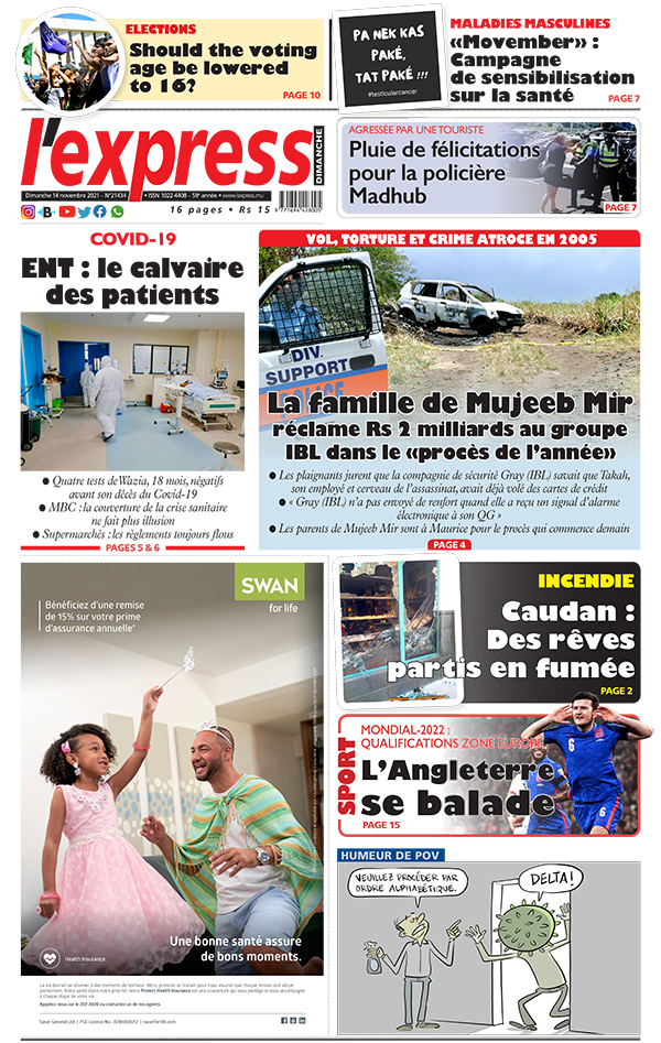 En une de l'express de ce dimanche 14 novembre 2021: Covid-19 │ ENT: le calvaire des patients ; Autre titre: Agressée par une Sud-Africaine: la WPC Maudhub félicitée par des internautes