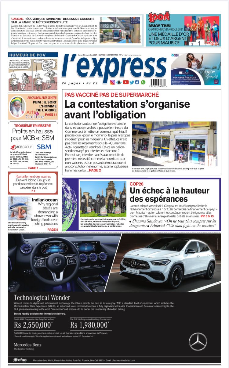 En une de l'express: Pas vacciné pas de supermarché: La contestation s’organise avant l’obligation ; Autre titre: COP26: Un échec à la hauteur des espérances.