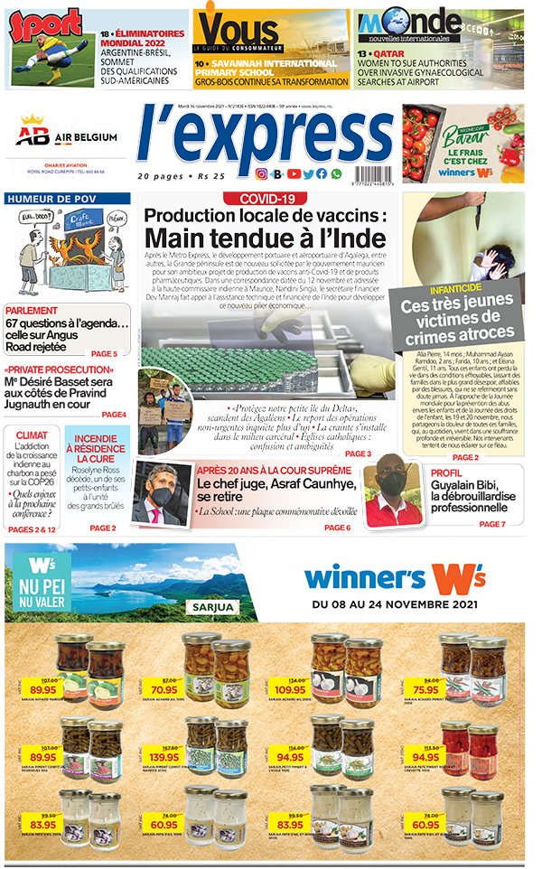 Main tendue à l’Inde COVID-19 Alia Pierre, 14 mois ; Muhammad Ayaan Ramdoo, 2 ans ; Farida, 10 ans ; et Eléana Gentil, 11 ans. Tous ces enfants ont perdu la vie dans des conditions effroyables, laissant des familles dans le plus grand désespoir, affaiblies par des blessures, qui ne se refermeront sans doute jamais. À l'approche de la Journée mondiale pour la prévention des abus envers les enfants et de la Journée des droits de l’enfant, les 19 et 20 novembre, nous partageons la douleur de toutes ces familles, qui, au quotidien, vivent dans une souffrance profonde et irréversible. Nos intervenants tentent de nous éclairer sur ce fléau. Après le Metro Express, le développement portuaire et aéroportuaire d’Agalega, entre autres, la Grande péninsule est de nouveau sollicitée par le gouvernement mauricien pour son ambitieux projet de production de vaccins anti-Covid-19 et de produits pharmaceutiques. Dans une correspondance datée du 12 novembre et adressée à la haute-commissaire indienne à Maurice, Nandini Singla, le secrétaire financier Dev Manraj fait appel à l’assistance technique et financière de l’Inde pour développer ce nouveau pilier économique…