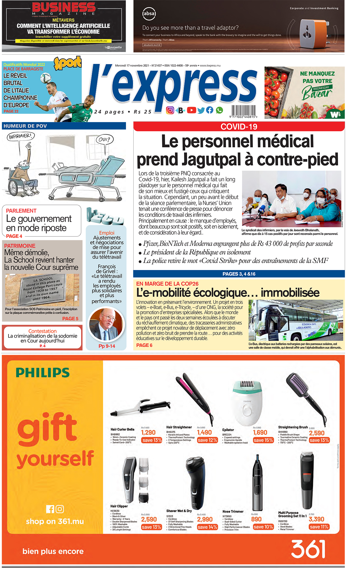 En Une de l'express; Covid-19 : Le personnel médical prend Jagutpal à contre-pied; Autre titre; En marge de la COP26 : L’e-mobilité écologique… immobilisée.