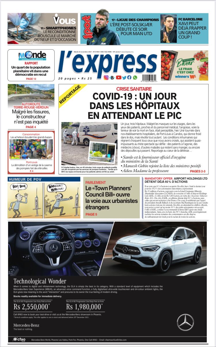En une de l'express: Reportage - Crise Sanitaire I Covid-19 : un jour dans les hôpitaux en attendant le pic ; Autre titre: Parlement: Le «Town Planners’ Council Bill » ouvre la voie aux urbanistes étrangers.