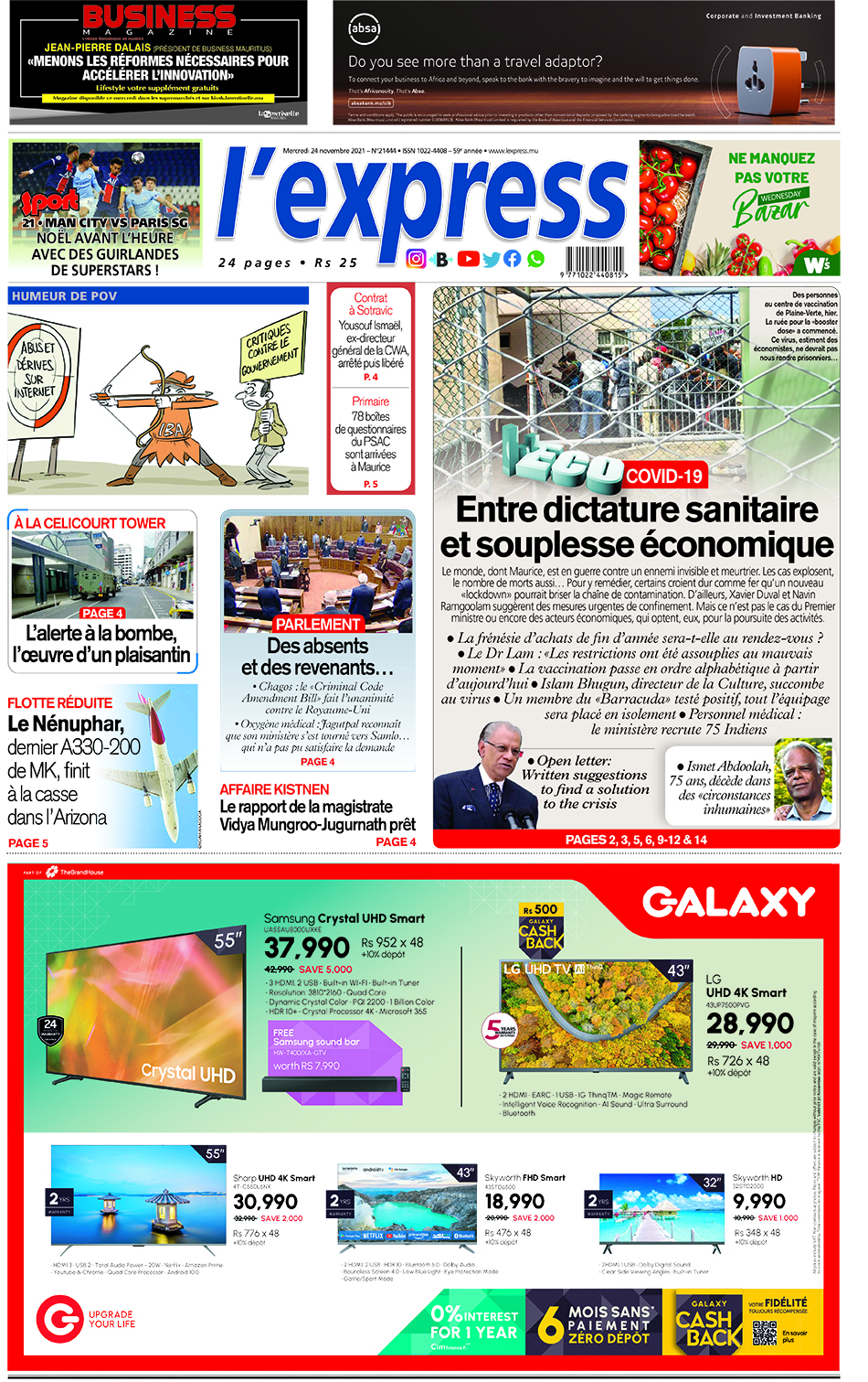 En Une de l'express; Covid-19 : Entre dictature sanitaire et souplesse économique; Autre titre; Flotte réduite : Le Nénuphar, dernier A330-200 de MK, finit à la casse dans l’Arizona.