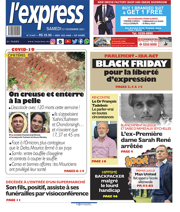 En une de l'express de ce samedi: Covid-19 │ Cimetières: on creuse et enterre à la pelle ; Autre titre: Consommation │ Black Friday: les Mauriciens ont préféré la santé