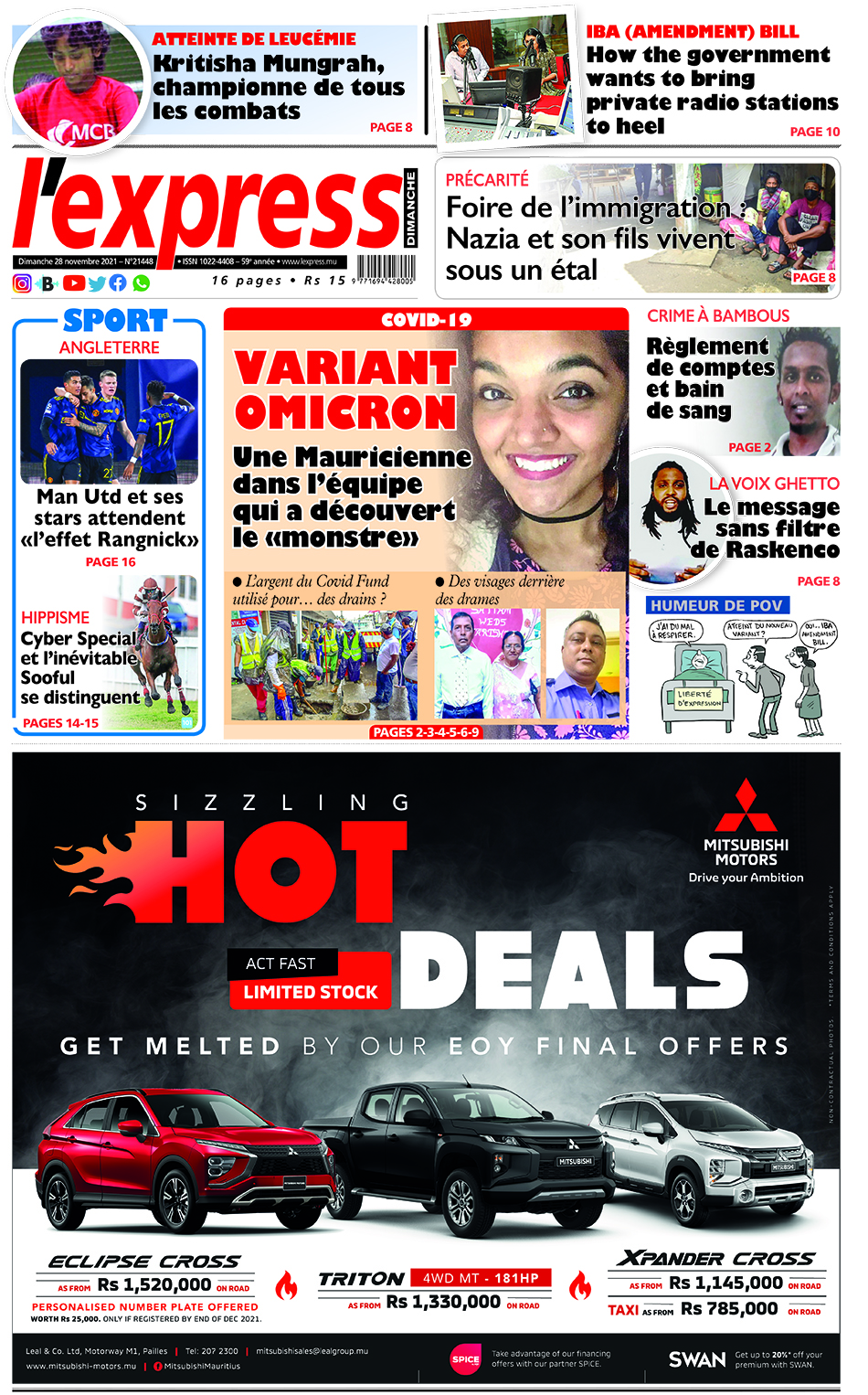 En Une de l'express; Covid-19 - Variant Omicron : Une Mauricienne dans l’équipe qui a découvert le «monstre»; Autre titre; Crime à Bambous : Règlement de comptes et bain de sang.