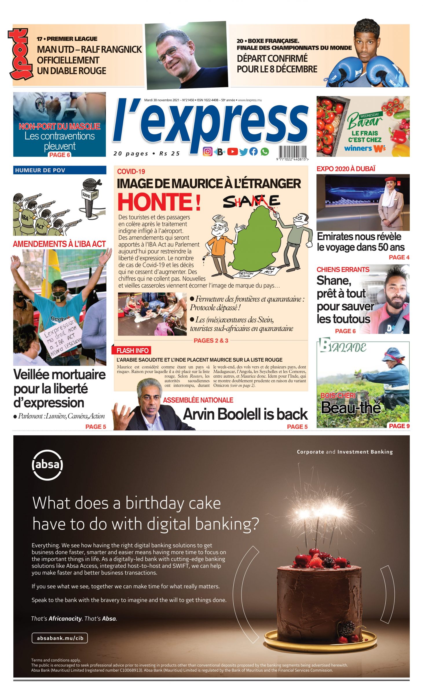 En une de l'express; Image de maurice à l’étranger: honte ! Autre titre; L’arabie Saoudite et l’Inde placent maurice sur la liste rouge.