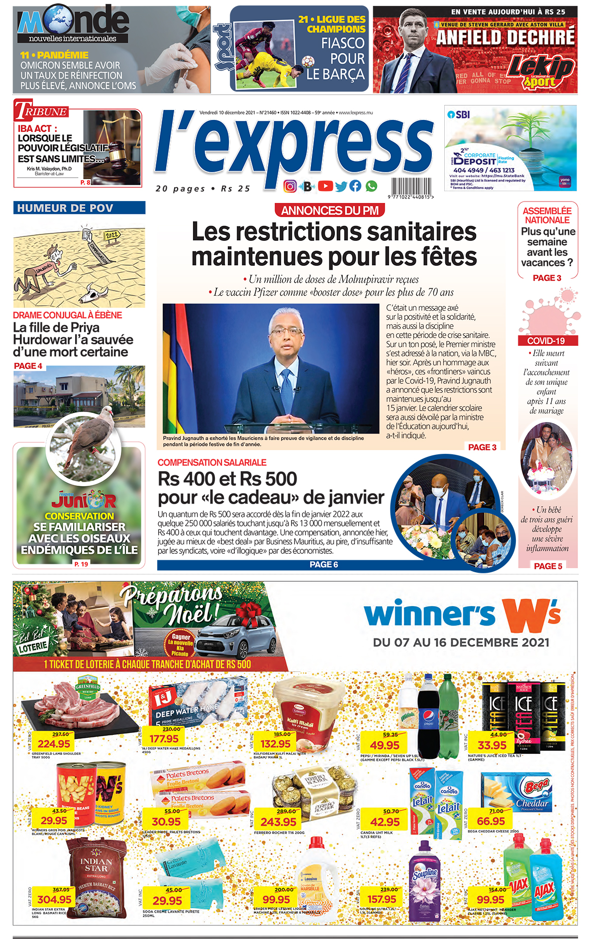 En une de l'express de ce vendredi: Annonces du PM : Les restrictions sanitaires maintenues pour les fêtes; Autre titre: Compensation salariale : Rs 400 et Rs 500 pour «le cadeau» de janvier.
