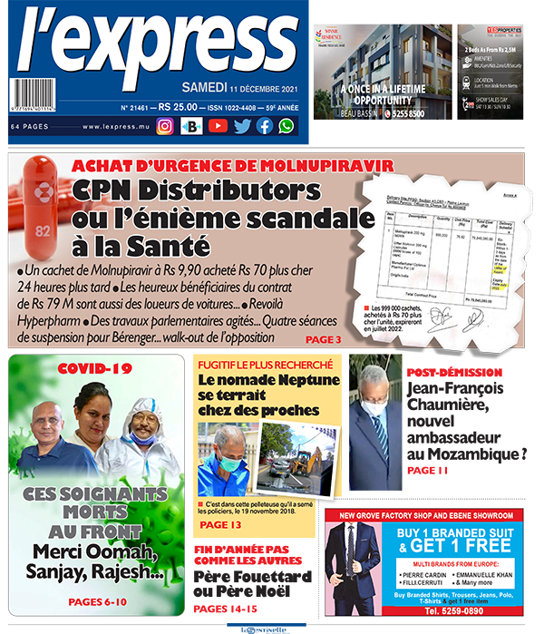 En une de l'express: Achat d’urgence de Molnupiravir: CPN Distributors ou l’énième scandale à la Santé ; Autre titre: Covid-19 │ Ces soignants morts au front: Merci Oomah, Sanjay, Rajesh...