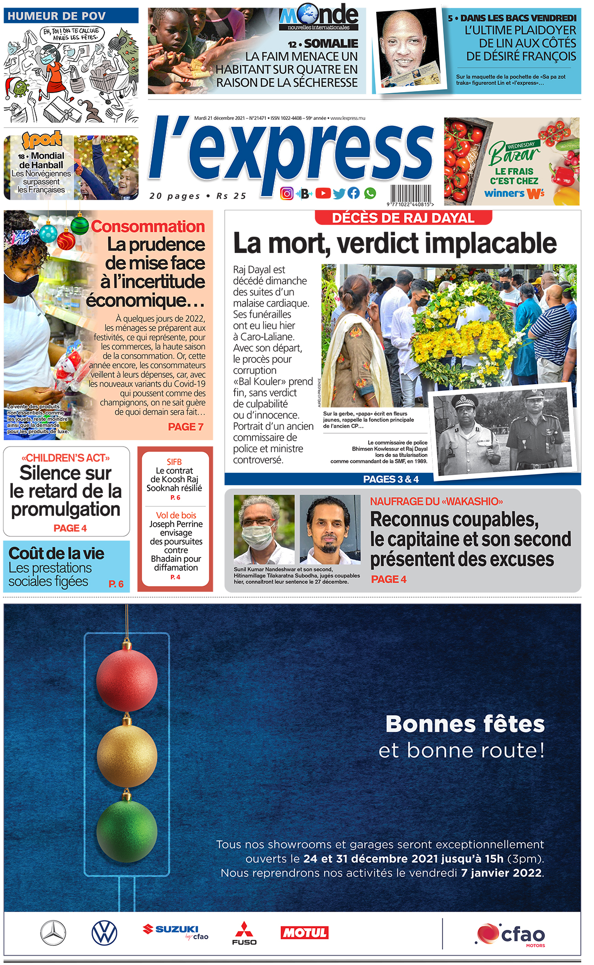 En une de l'express de ce mardi: Décès de Raj Dayal: La mort, verdict implacable; Autre titre: Consommation : La prudence de mise face à l’incertitude économique…