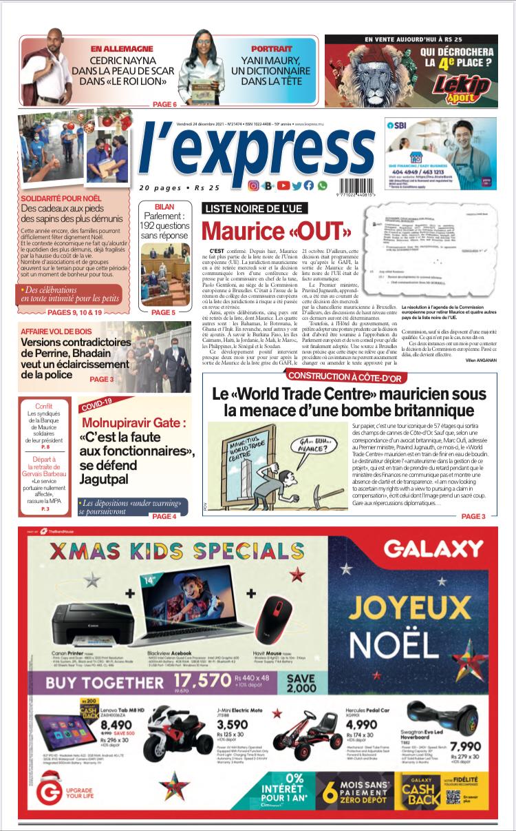 En une de l'express: Liste noire de l’UE: Maurice «OUT» ; Autre titre: Construction à Côte-d’Or: Le «World Trade Centre» mauricien sous la menace d’une bombe britannique.