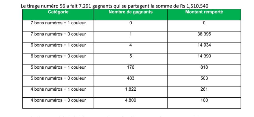 La totale de vente réalisée à la fermeture du jeu du 56e tirage sous la supervision de la GRA: Rs 5,071,470 et le montant collecté par Lottotech pour le compte du Consolidated Fund of Mauritius sous la supervision de la GRA pour le 56e tirage: Rs 1,071,483.95