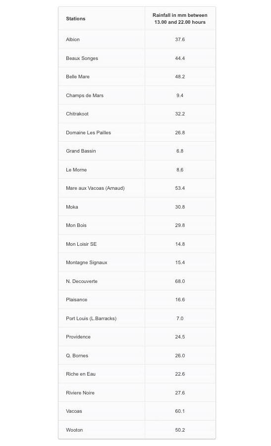 D’ici-là, la pluie sera-t-elle plus abondante qu’hier ? Le risque est là, explique la station météo, et ce même si la pluviométrie d’hier était plutôt impressionnante. Voici les chiffres publiés aujourd’hui par la station météo de Vacoas :