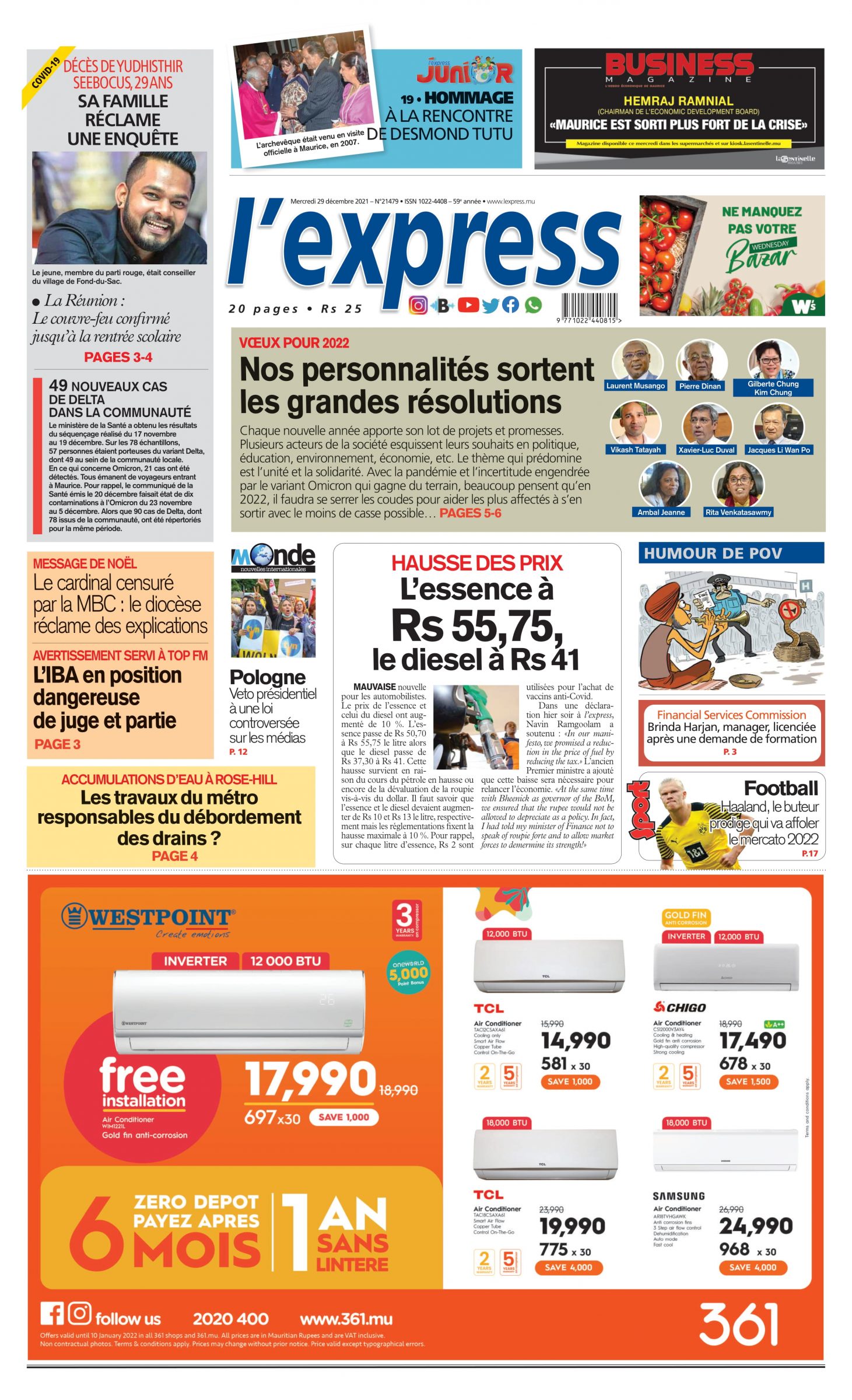 En une de L'express; Nos personnalités sortent les grandes résolutions; Autre titre: Décès de Yudhisthir Seebocus, 29 ans sa famille réclame une enquête.