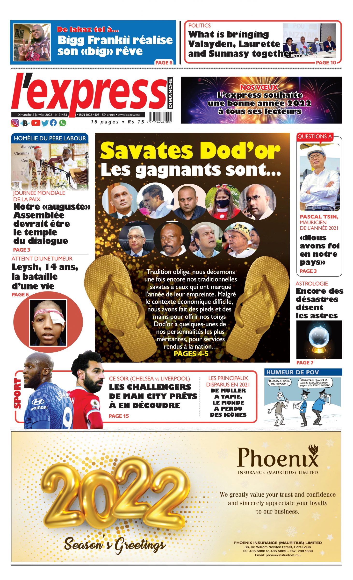 En une de l'express de ce dimanche: Savates Dod’or Les gagnants sont…Autre titre : Atteint d’une tumeur Leysh, 14 ans, la bataille d’une vie.