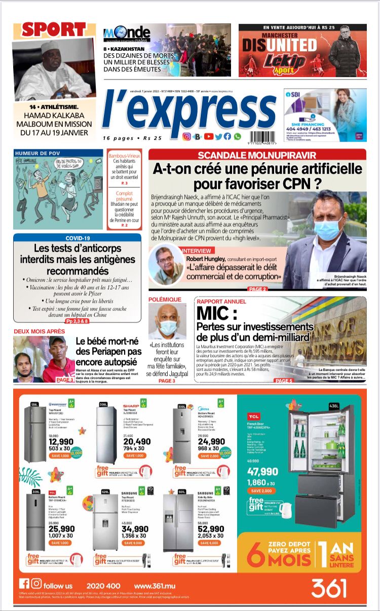 En une de l'express: Scandale Molnupiravir: A-t-on créé une pénurie artificielle pour favoriser CPN ? Autre titre: Rapport Annuel - MIC : Pertes sur investissements de plus d’un demi-milliard.