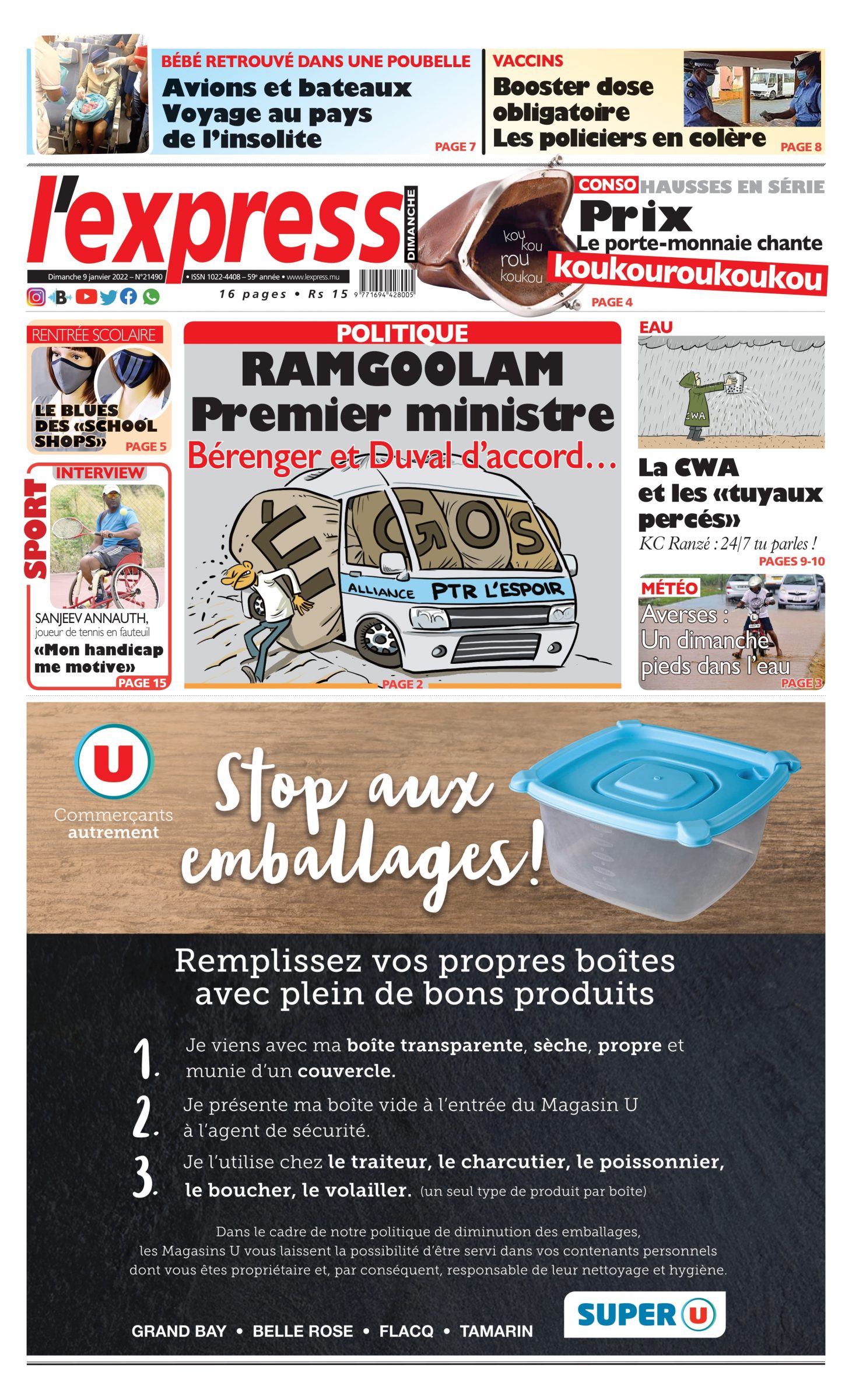 En une de l'express : Ramgoolam Premier ministre Bérenger et Duval d’accord…Autre titre: Le blues des «school shops»