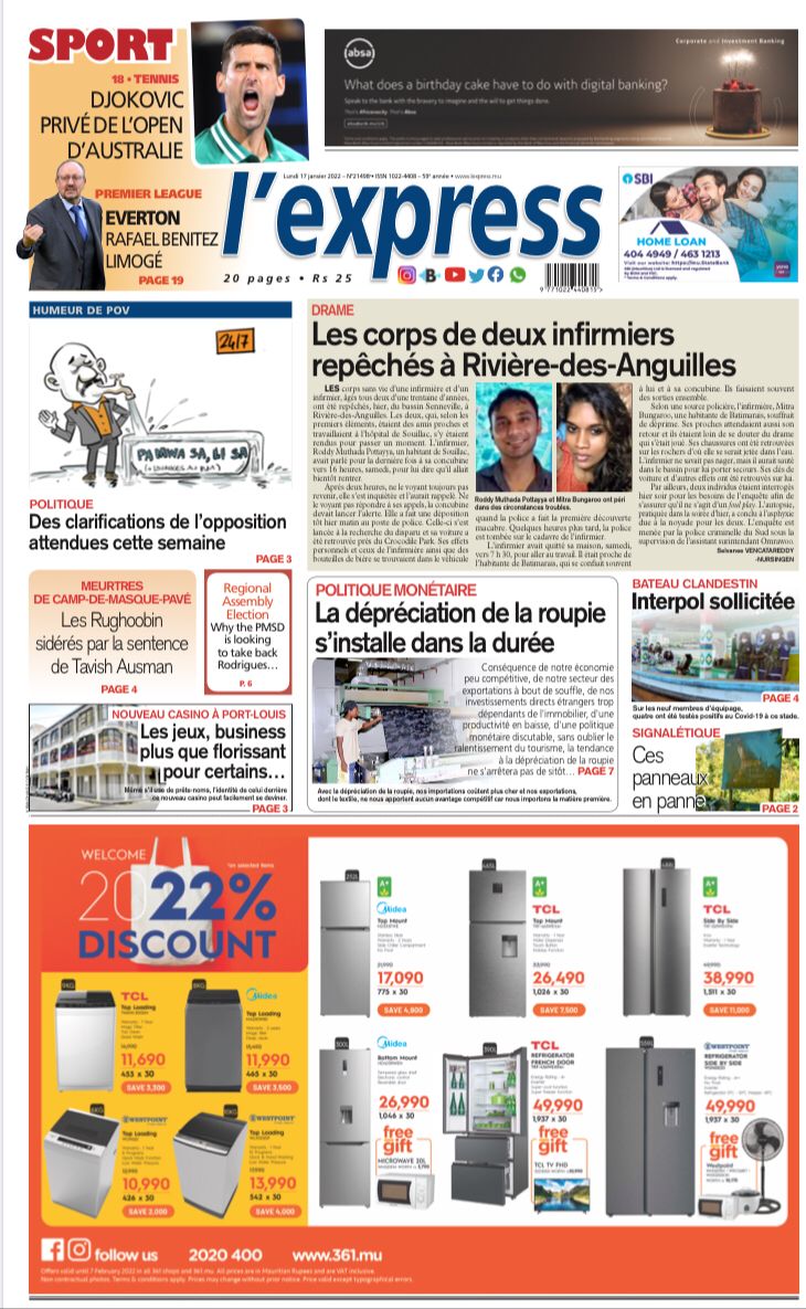 En une de l'express: Drame: Les corps de deux infirmiers repêchés à Rivière-des-Anguilles; Autre titre: Politique Monétaire: La dépréciation de la roupie s’installe dans la durée.