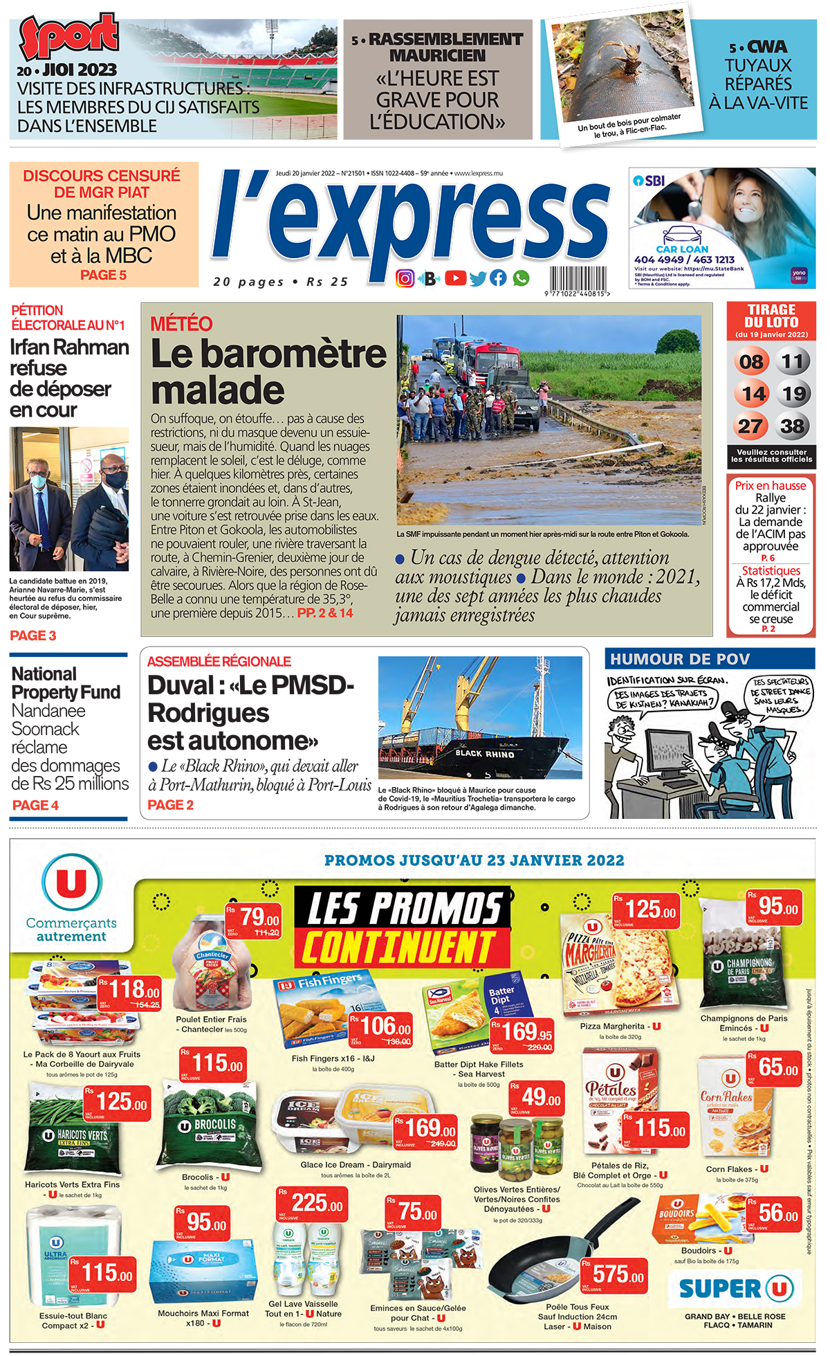 En une de l'express: Météo : Le baromètre malade; Autre titre: Pétition électorale au n°1 : Irfan Rahman refuse de déposer en cour.