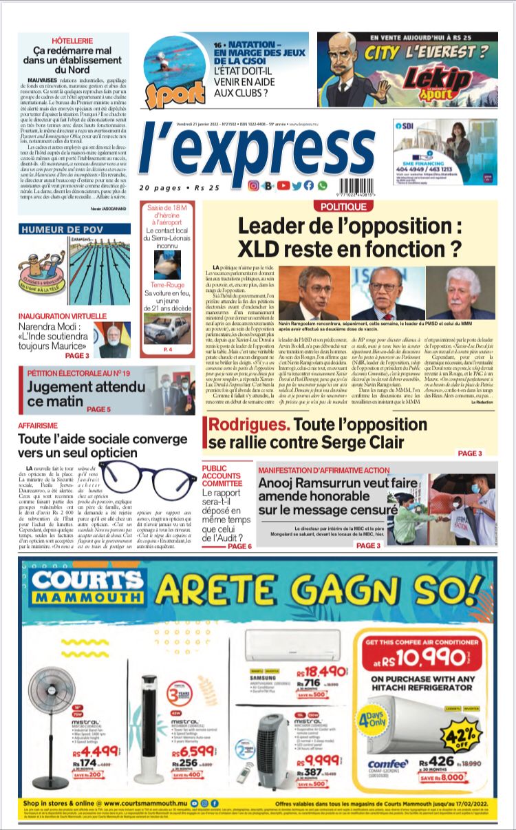 En une de l'express: Politique - Leader de l’opposition : XLD reste en fonction ? ; Autre titre: Rodrigues: Toute l’opposition se rallie contre Serge Clair.