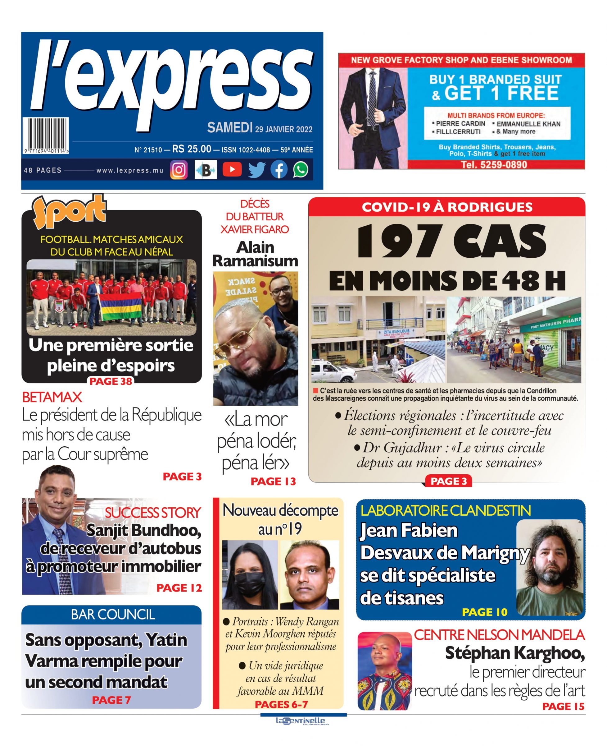 En une de l'express; Covid-19 à Rodrigues: 197 cas en moins de 48 h; Autre titre: Betamax: Le président de la République mis hors de cause par la Cour suprême.