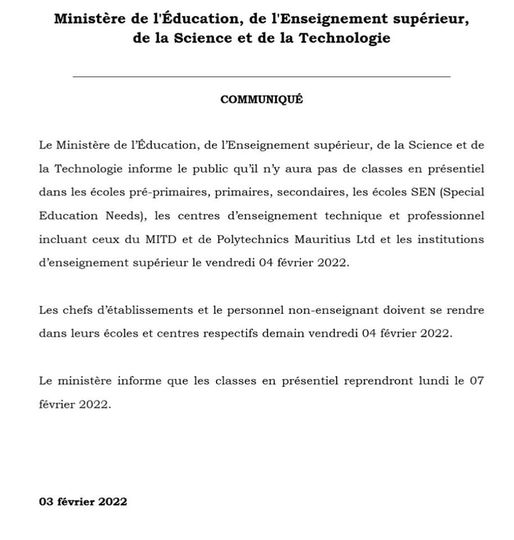 Le ministère de l’Education a annoncé que les classes en présentiel reprendront le lundi 7 février et non pas le vendredi 4 février.