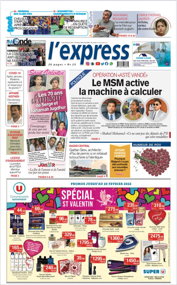 En une de l'express: Politique – Opération «Asté Vandé»: Le MSM active la machine à calculer; Autre titre: Saint-Valentin: Les 70 ans d’amour de Serge et Mariamah Jugdhur