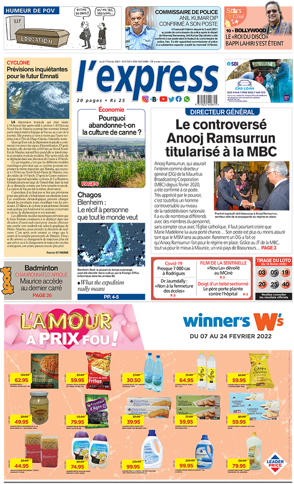 En une de l'express: Directeur général: le controversé Anooj Ramsurrun titularisé à la MBC ; Autre titre: Blenheim: récif «terra nullius» devenu objet de toutes les convoitises