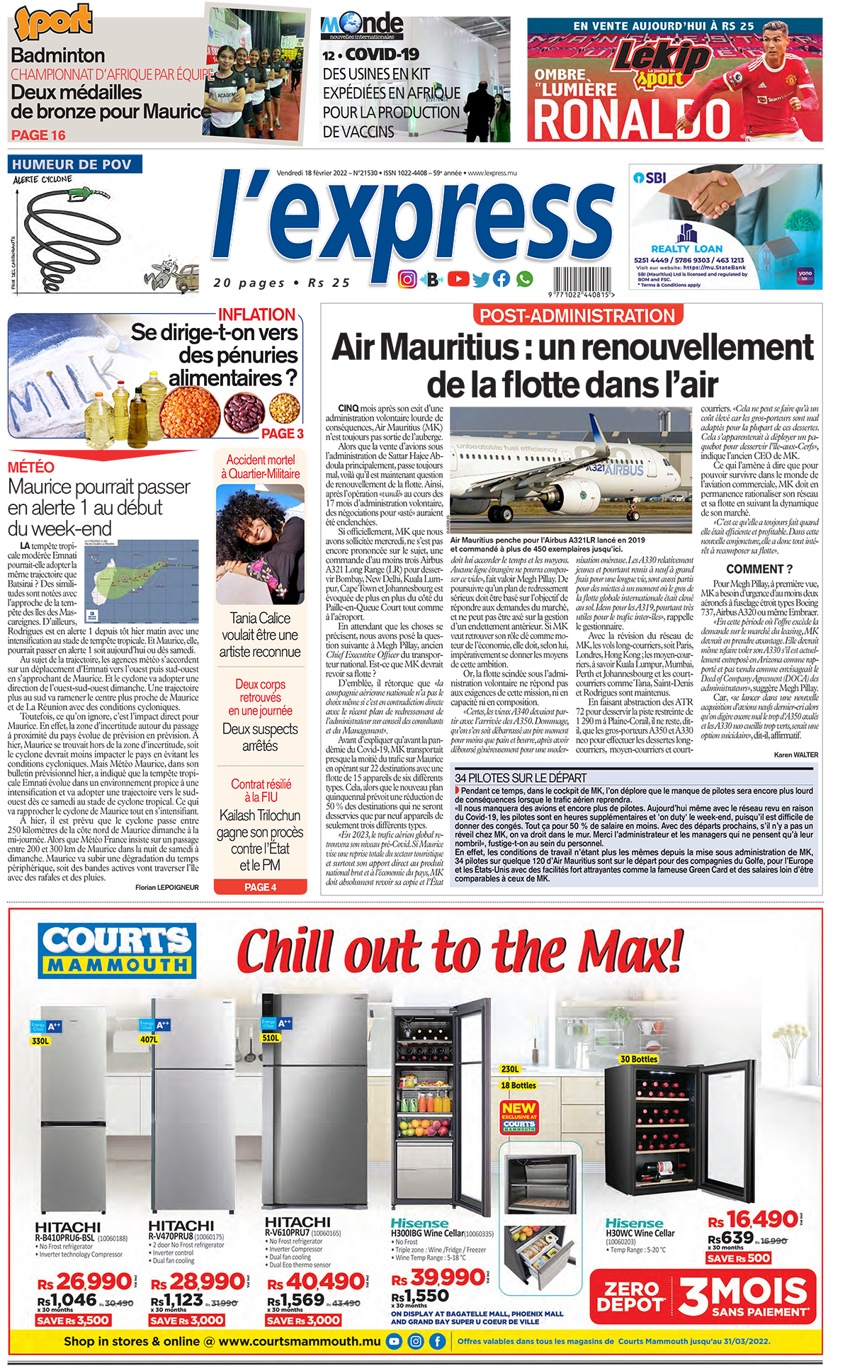 En une de l'express: Post-Administration - Air Mauritius : un renouvellement de la flotte dans l’air; Autre titre: Inflation : Se dirige-t-on vers des pénuries alimentaires ?