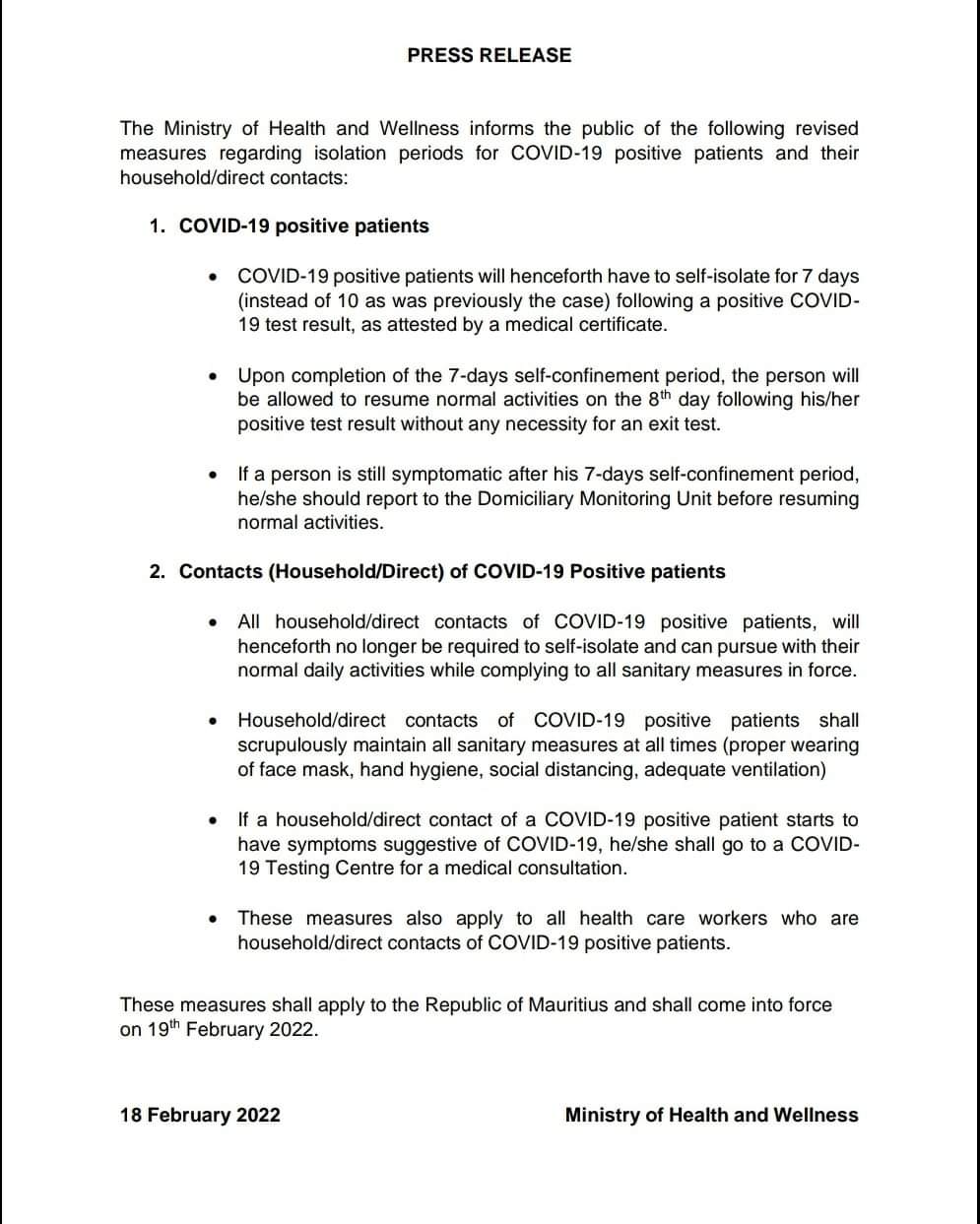 Le ministère de la Santé a révisé le protocole pour les patients positifs et les cas contacts. En effet, à partir de ce samedi 19 février, les patients testés positifs et avec confirmation par un certificat médical vont devoir s’isoler sept jours au lieu de 10 précédemment. Si le patient n’a plus aucun symptôme, il peut reprendre une vie normale au 8e jour sans test. En revanche, si les symptômes persistent au-delà de sept jours, il devra contacter la Domiciliary Monitoring Unit de l’hôpital de sa région pour des tests d’usage avant de reprendre une vie normale.