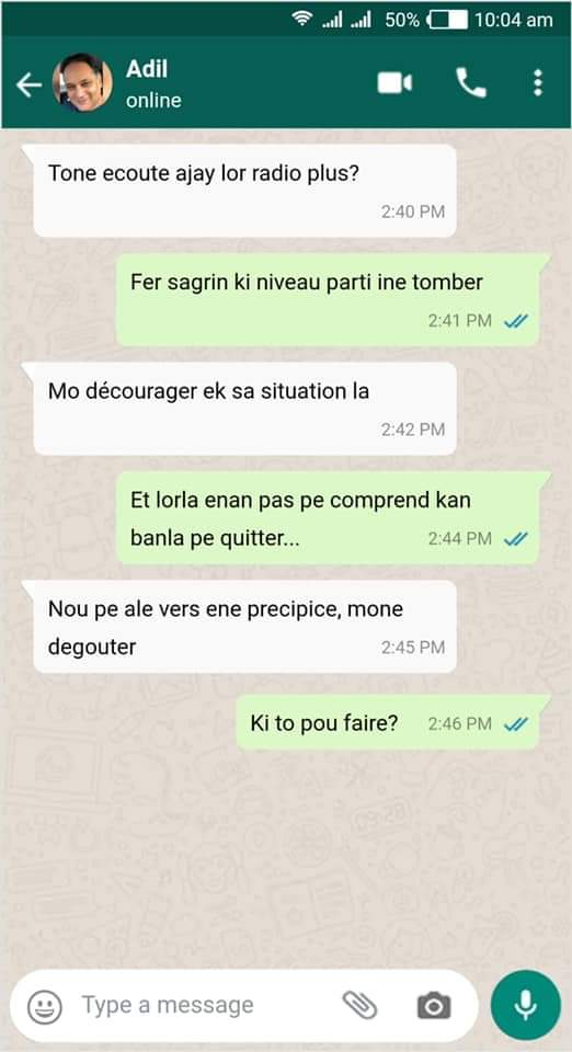 Depuis la mi-journée, une capture d’écran d’une conversation qu’Aadil Ameer Meea aurait tenue circule sur WhatsApp. Cette conversation se lit comme suit :