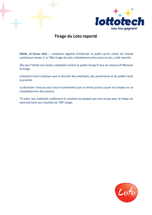 Il faudra attendre pour savoir si vous êtes le grand gagnant. Lottotech a émis un communiqué ce samedi 19 février pour prévenir le public que le tirage de ce soir n’aura pas lieu suite à l’alerte cyclonique niveau 3.