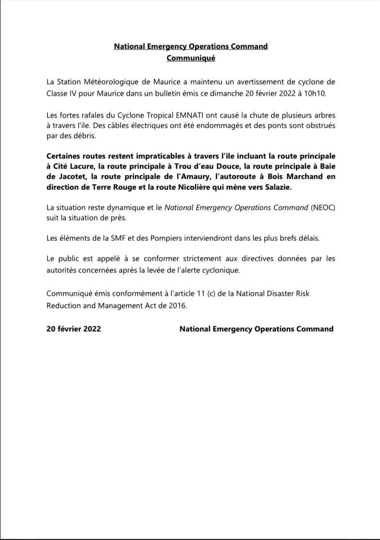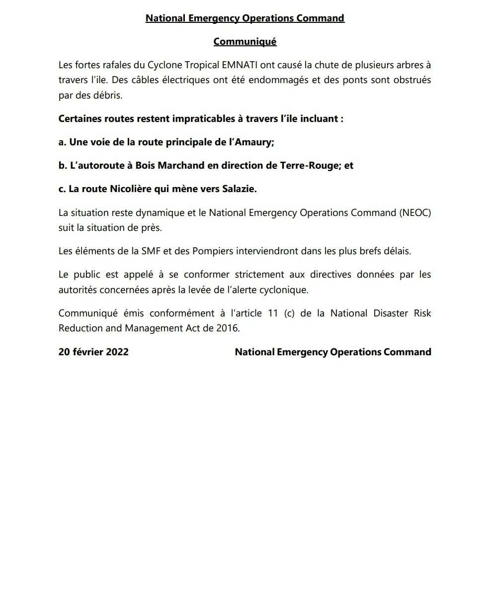 Selon un communiqué de la National Emergency Operations Command émis dans la matinée de ce dimanche 20 février, plusieurs routes ont été obstruées par les arbres et fils électriques.