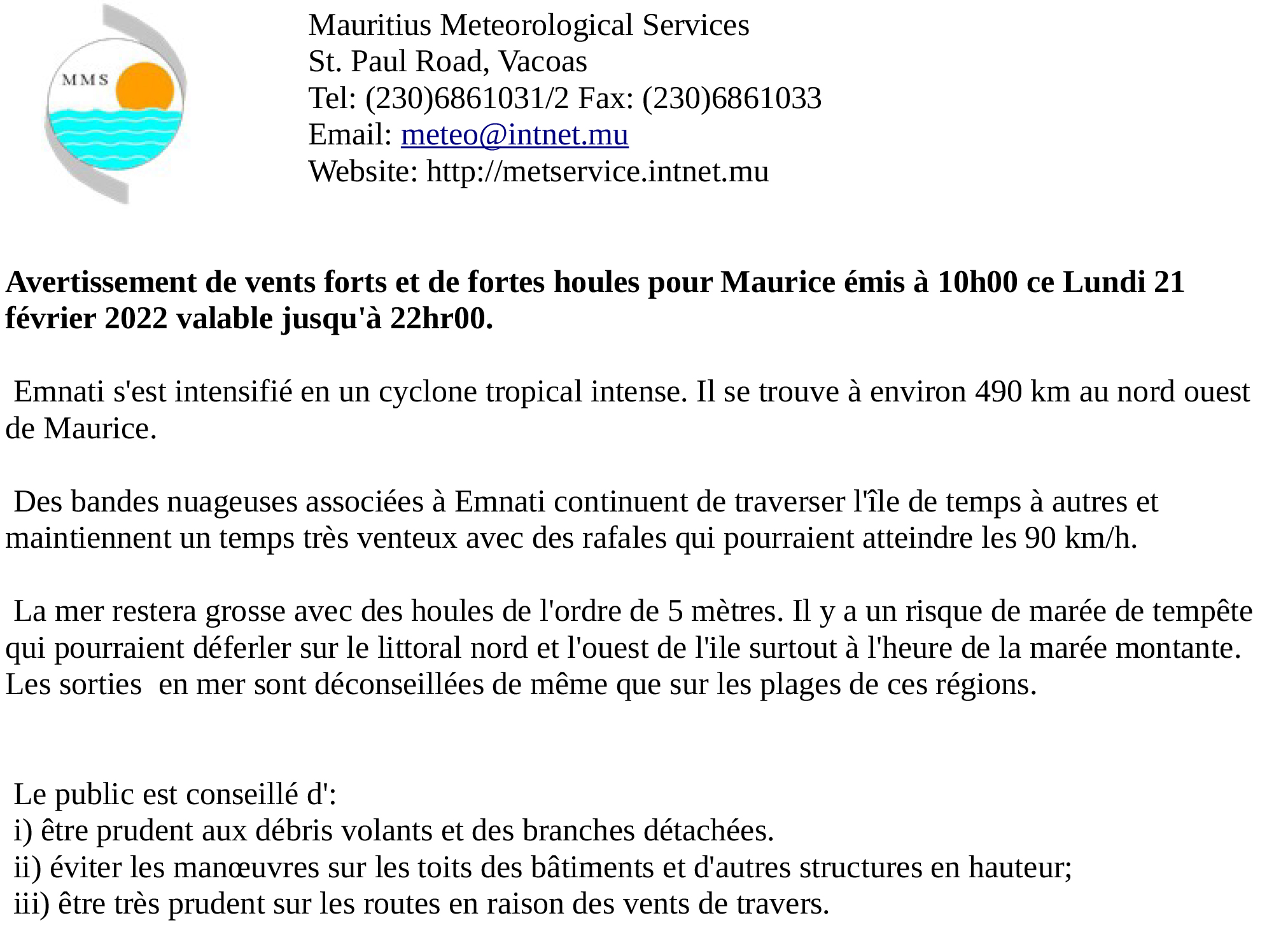 La station météorologique de Vacoas a émis un avis de vents forts et de fortes houles pour Maurice à 10 heures ce lundi 21 février 2022 valable jusqu'à 22 heures.