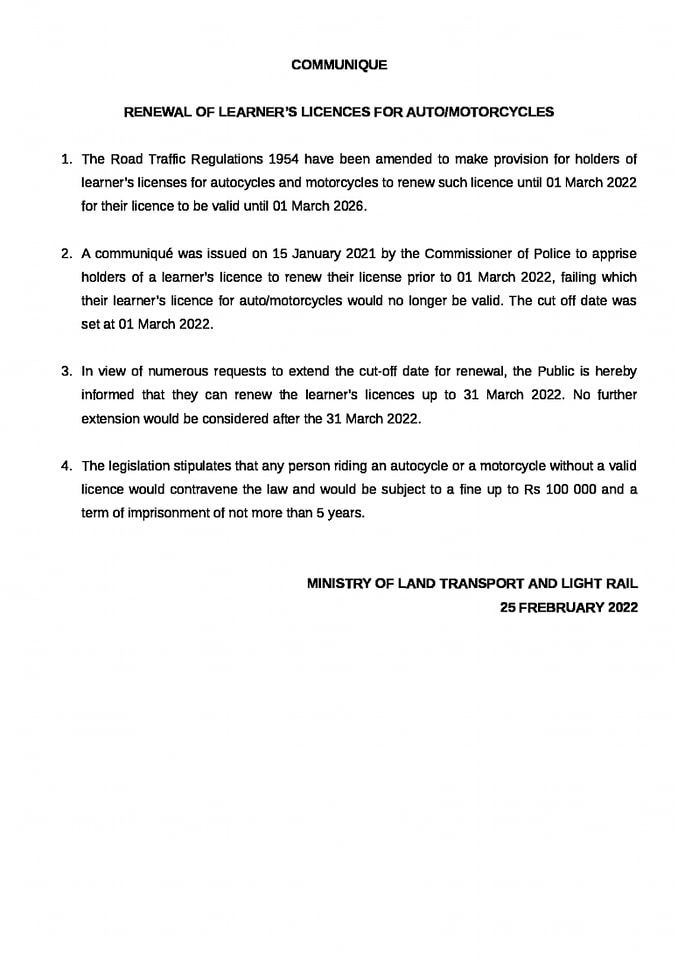 Les files d’attente s’étirent à perte de vue depuis quelques jours, devant les Casernes centrales, à Port-Louis. Des motocyclistes s’y rendent en fait, pour renouveler leur learner. Face à la situation chaotique, les autorités ont décidé d’étendre le délai, qui expirait le 1er mars, au 31 mars 2022. Un communiqué a été émis en ce sens en ce vendredi 25 février.