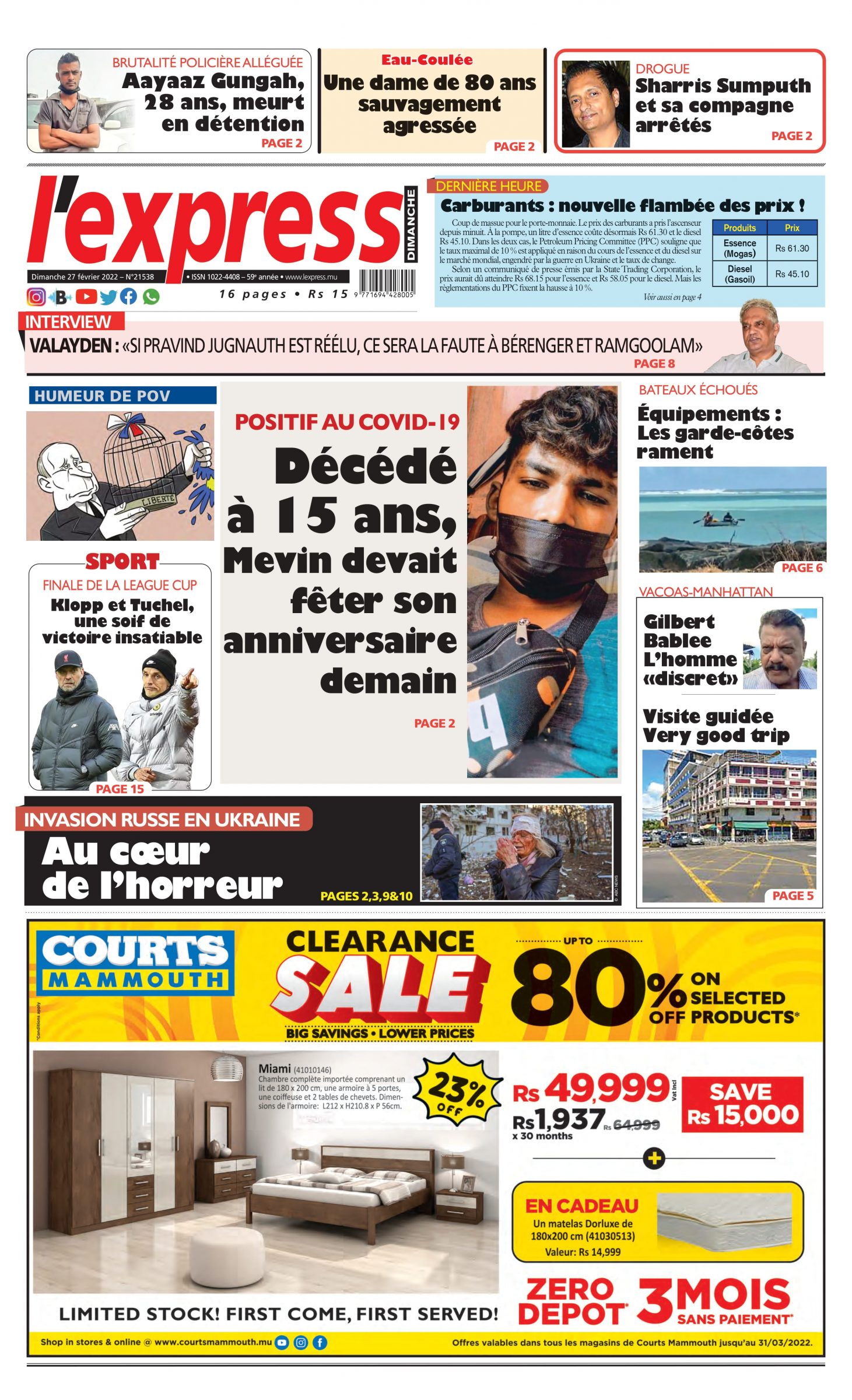 En une de l'express; Décédé à 15 ans, Mevin devait fêter son anniversaire demain;  Autre titre; Vacoas-Manhattan: Gilbert Bablee L’homme «discret»