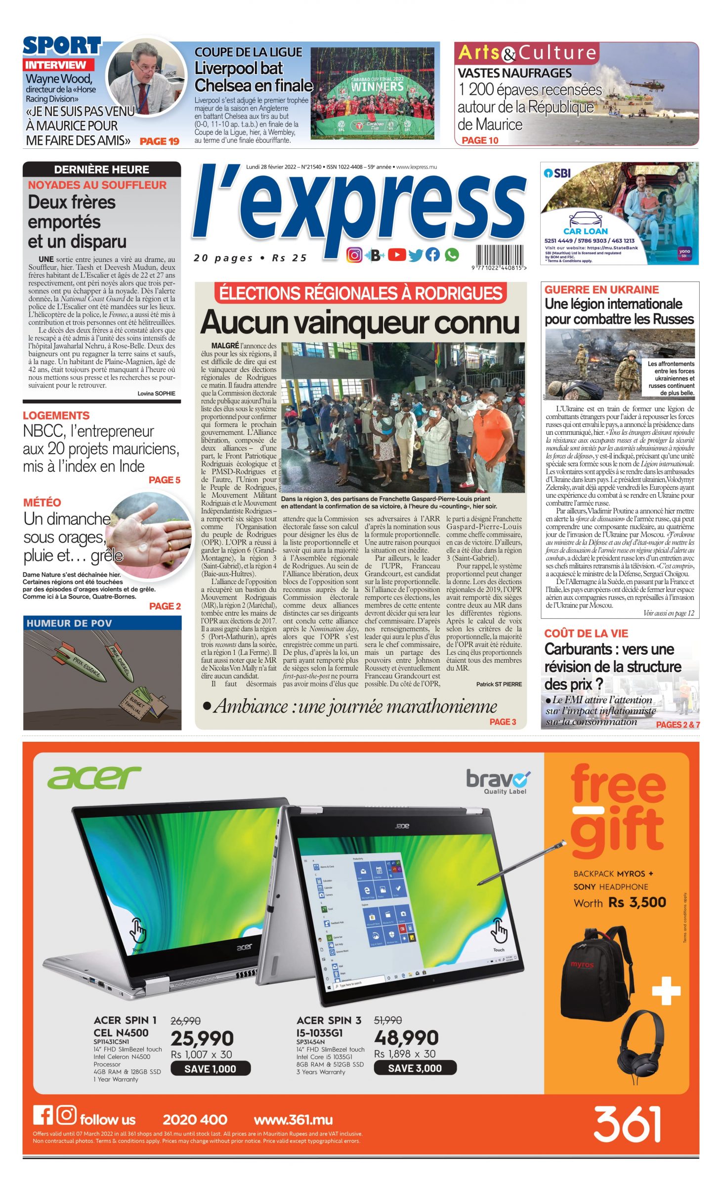 En une de l'express; Carburants: Vers une révision de la structure des prix ?; Autre titre; NBCC, l’entrepreneur aux 20 projets mauriciens, mis à l’index en Inde.