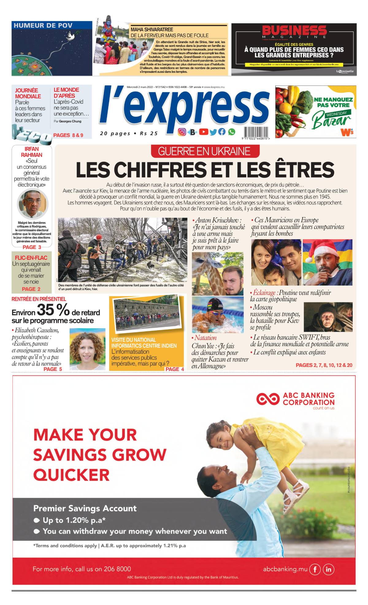 En une de l'express: Guerre en Ukraine : Les chiffres et les êtres ; Autre titre: Irfan Rahman : «Seul un consensus général permettra le vote électronique».