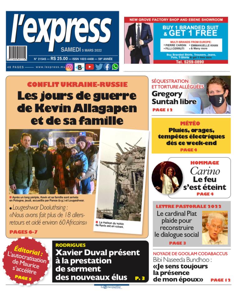 En une de l'express: Conflit Ukraine-Russie: Les jours de guerre de Kevin Allagapen et de sa famille ; Autre titre: Rodrigues: Xavier Duval présent à la prestation de serment des nouveaux élus