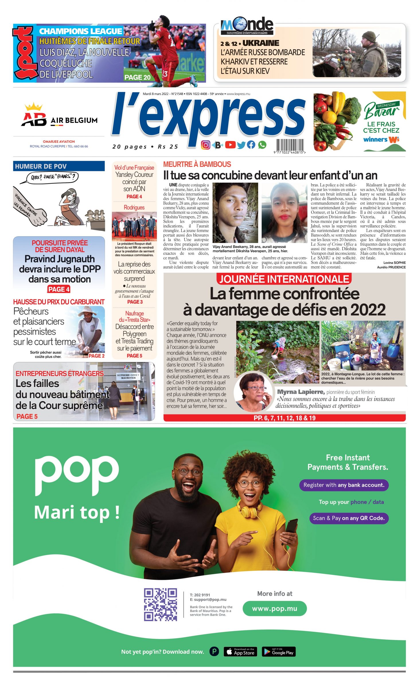 En une de l'express; Meurtre à Bambous: il tue sa concubine devant leur enfant d’un an; Autre titre; La femme confrontée à davantage de défis en 2022