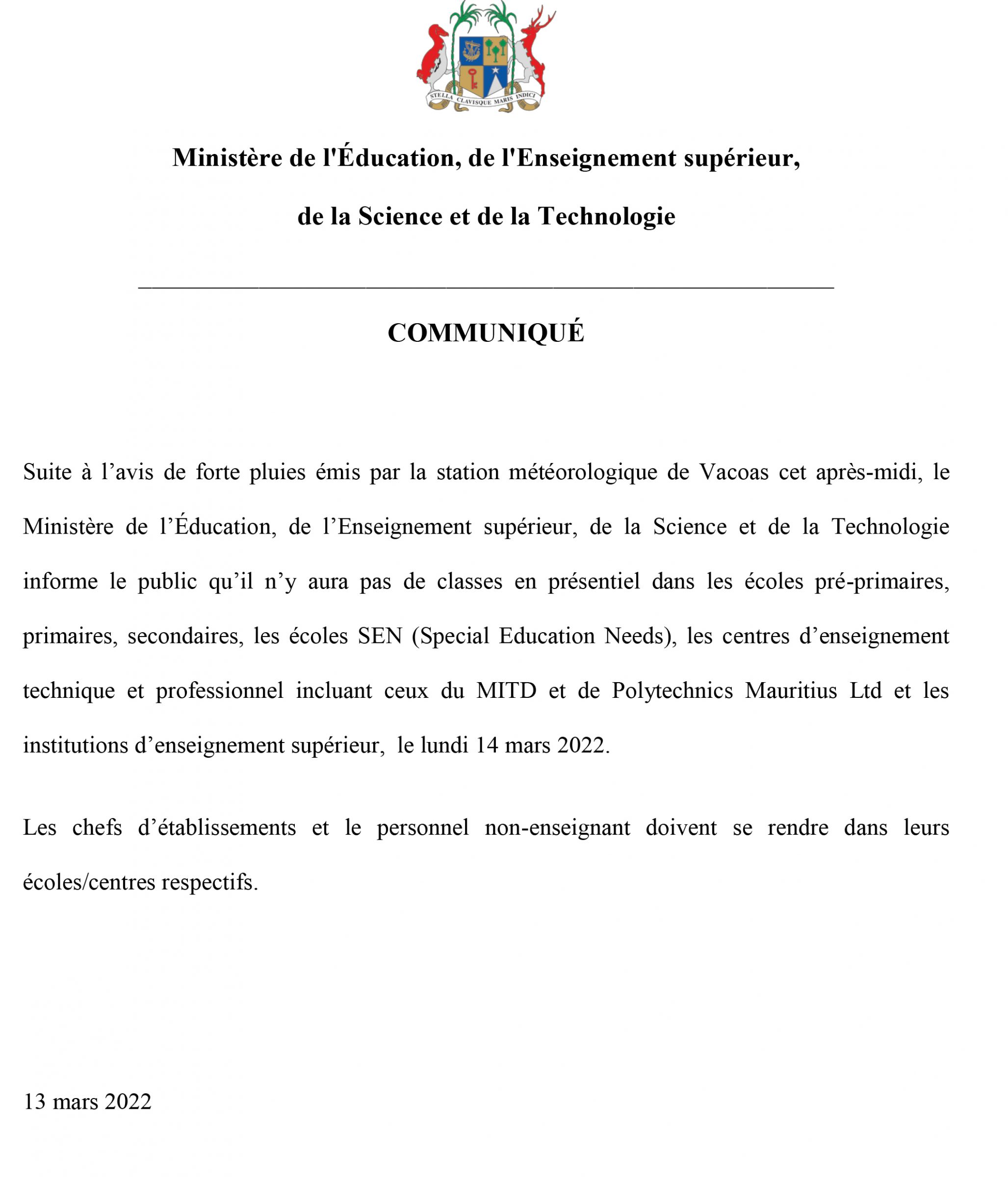 [Communiqué] Pas d’école le lundi 14 mars
