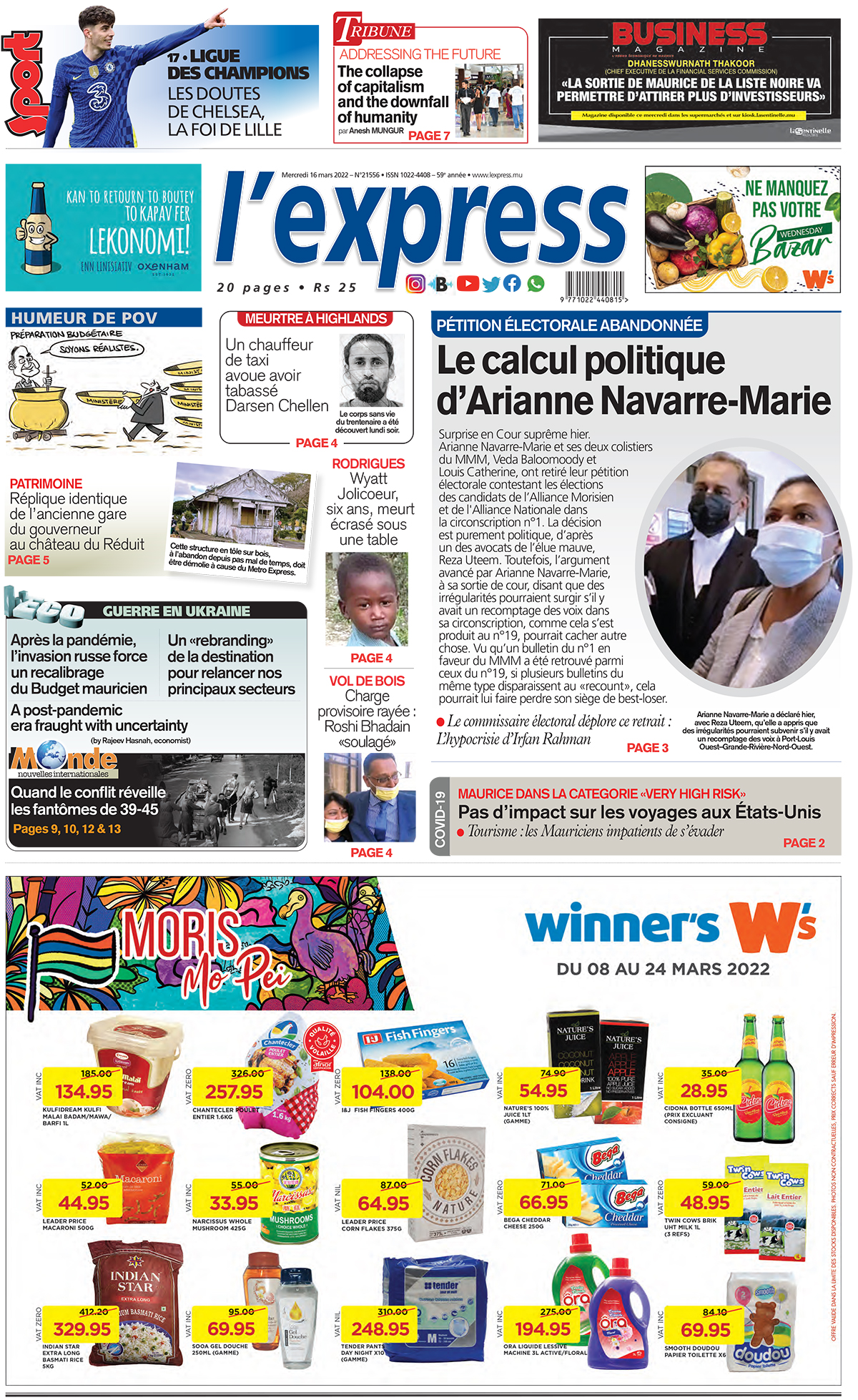 En une de l'express: Pétition électorale abandonnée: Le calcul politique d’Arianne Navarre-Marie; Autre titre: Covid-19 : Maurice dans la categorie «very high risk».
