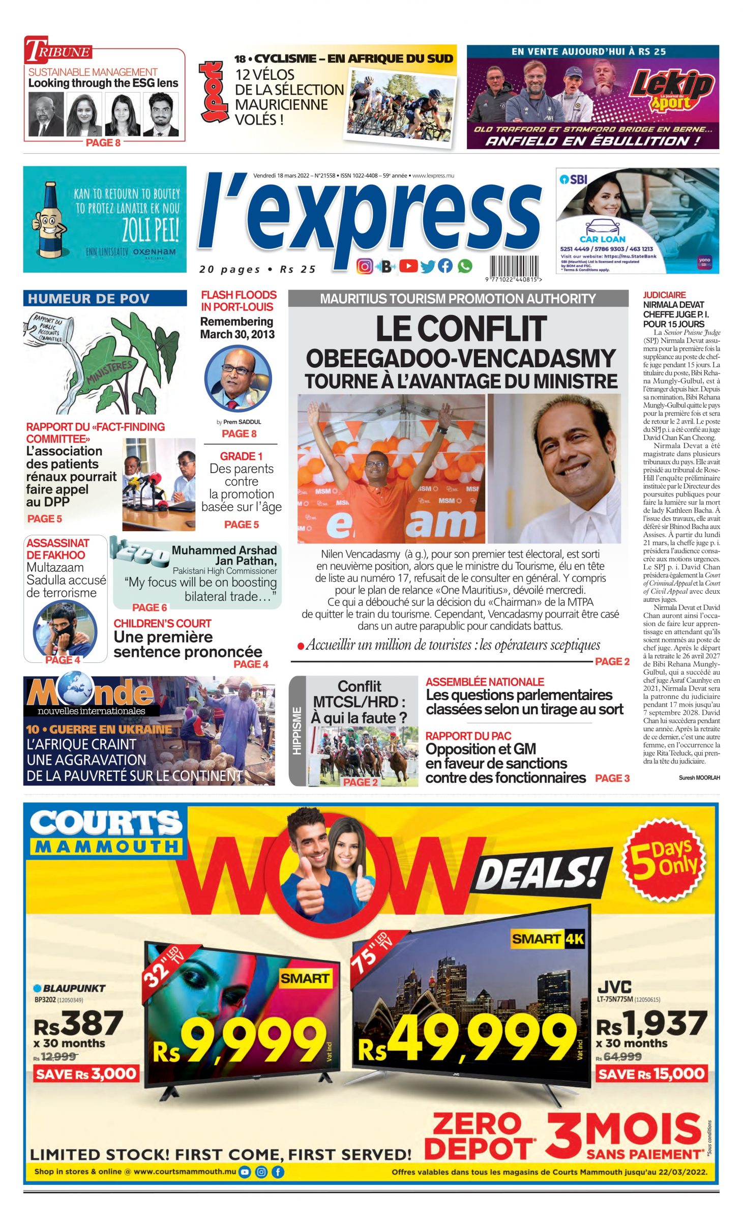 En Une de l'express; Le conflit Obeegadoo-Vencadasmy tourne à l’avantage du ministre; Autre titre; Children’s court :une première sentence prononcée.