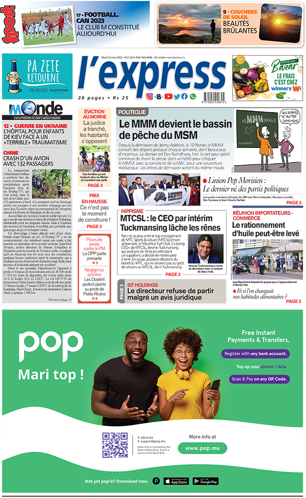En une de l'express: Politique: le MMM devient le bassin de pêche du MSM ; Autre titre: MTCSL: le CEO par intérim Tuckmansing lâche les rênes