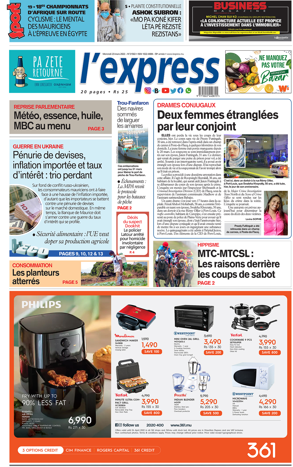 En une de l'express: Drames conjugaux : Deux femmes étranglées par leur conjoint ; Autre titre: MTC-MTCSL : Les raisons derrière les coups de sabot.
