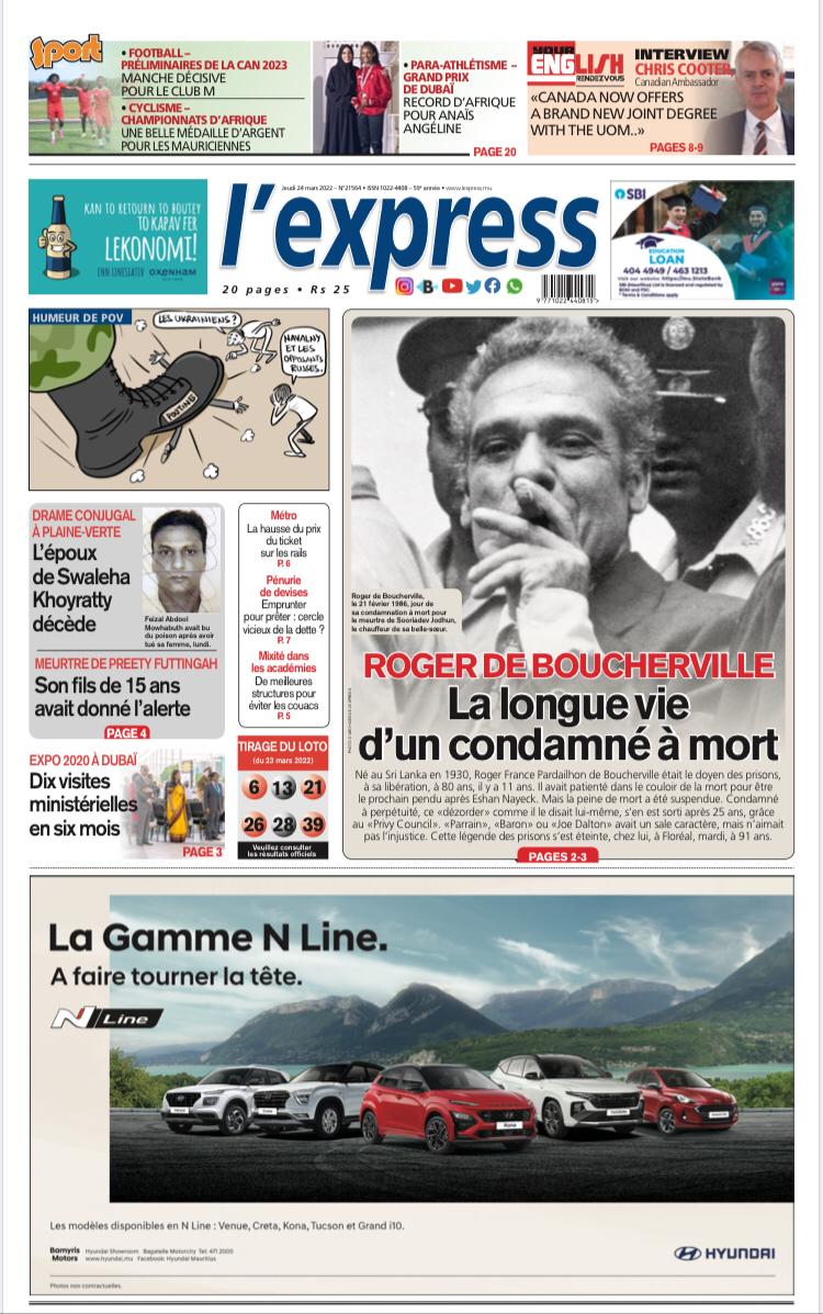 En une de l'express: Roger de Boucherville: La longue vie d’un condamné à mort ; Autre titre: Drame conjugal à Plaine-Verte: L’époux de Swaleha Khoyratty décède