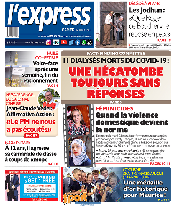 Électrochoc le mardi 22 mars. Deux femmes meurent étranglées par leur conjoint. Preety Futtingah, 30 ans, a été retrouvée dans l’après-midi dans un champ de cannes à Poste-de-Flacq, alors que Swaleha Khoyratty, 50 ans, a été découverte dans son appartement.